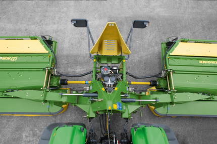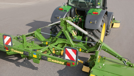 Для особенно равномерного копирования почвы правая и левая косилка подвешена системой тяг DuoGrip по центру тяжести, а сбоку ведется рычагами. Заднее освещение в дополнительной комплектации может подниматься гидравлически. Это образовывает во время работы по центру значительно больше пространства для валка. При опускании повышается безопасность транспортного движения.
