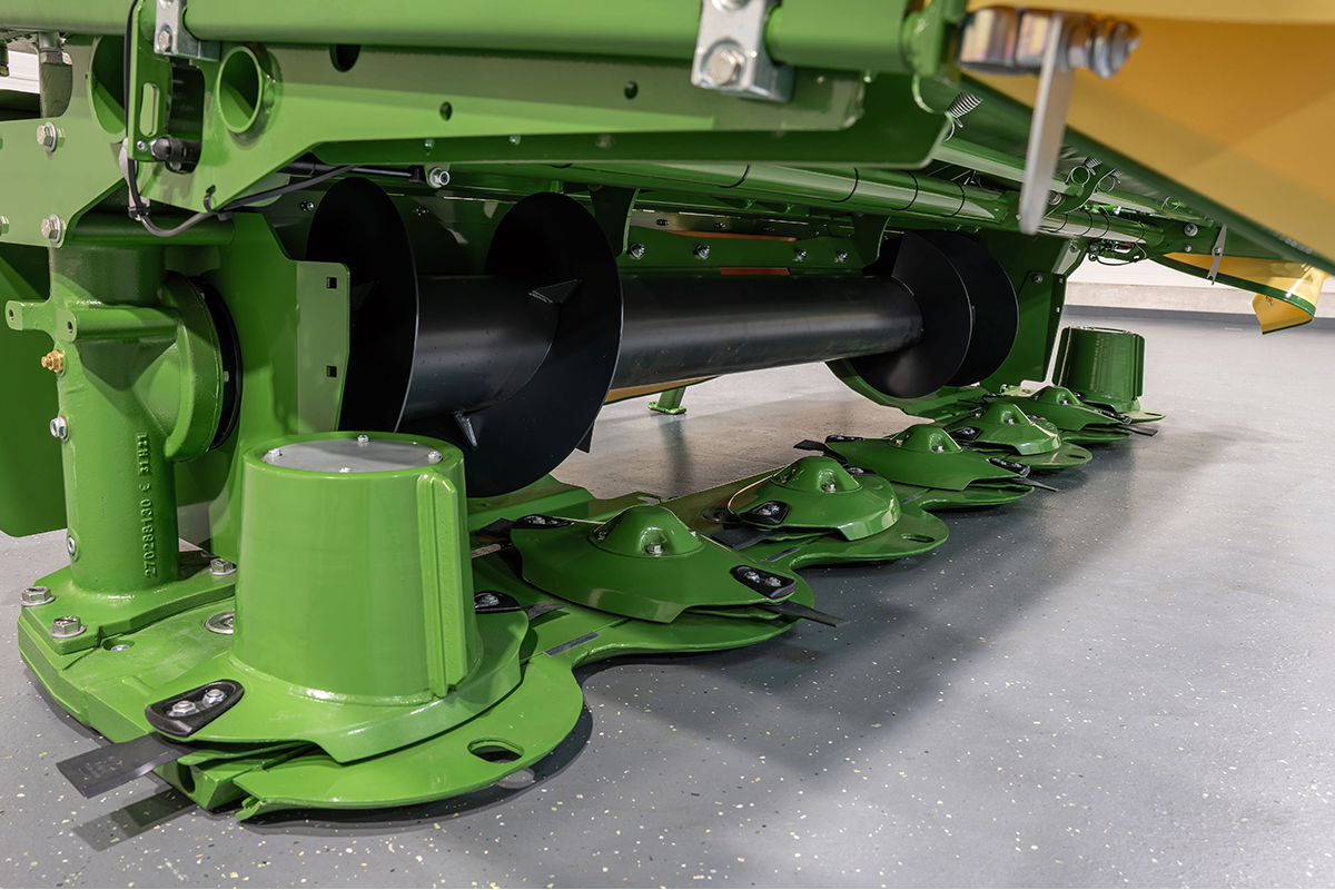 Планетарный привод, разработанный KRONE, находится в косилочном брусе, который успешно эксплуатируется на протяжении десятилетий во всем мире: большие цилиндрические шестерни с зубьями до 59 штук передают усилие от главного привода до конца косилочного бруса. По причине их большого диаметра они вращаются медленнее и больше зубьев входят в зацепление с большим количеством соседних цилиндрических шестерен. Эта конструкция подкупает плавностью хода, лучшей передачей усилия и высоким сроком службы. Предшествующие вспомогательные приводы приводят в действие только по одному соответствующему косилочному диску и подвергаются лишь незначительным нагрузкам.