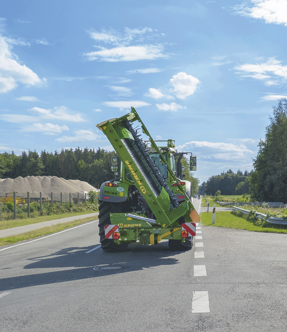 Для транспортировки по дороге EasyCut R 360 переводится за мертвую точку вверх. Ее положение по центру и плотное расположение к трактору повышает комфорт езды, особенно с небольшими тракторами.