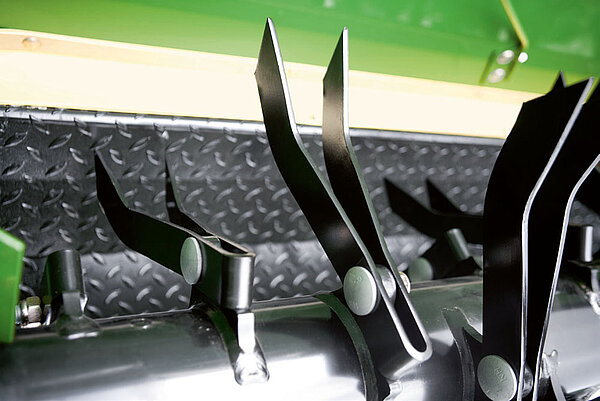 Закаленные с агрессивным углом захвата V-образные стальные битеры работают интенсивно и являются крайне эффективными. При столкновении с посторонними предметами битеры могут отклоняться назад. Ограниченный маятниковый ход вперед повышает срок эксплуатации крепежных пальцев.