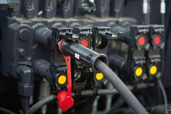Гидравлическое подключение одностороннего действия достаточно для того, чтобы переводить задние дисковые косилки EasyCut R 280 и EasyCut R 320 из рабочего положения в транспортное или положение для работы на разворотной полосе.