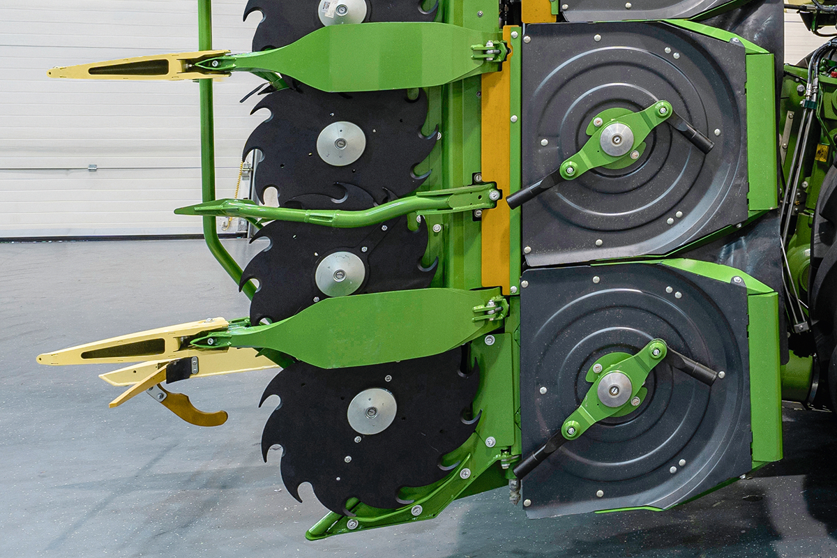 С помощью эксцентричных передних двигателей колес с регулировкой высоты при установке меньших или больших передних колес положение блока подборщика, питающего агрегата и днища измельчающего барабана по отношению к следующему измельчающему каналу сохраняется. Так стабильно обеспечивается оптимальный и равномерный поток растительной массы.