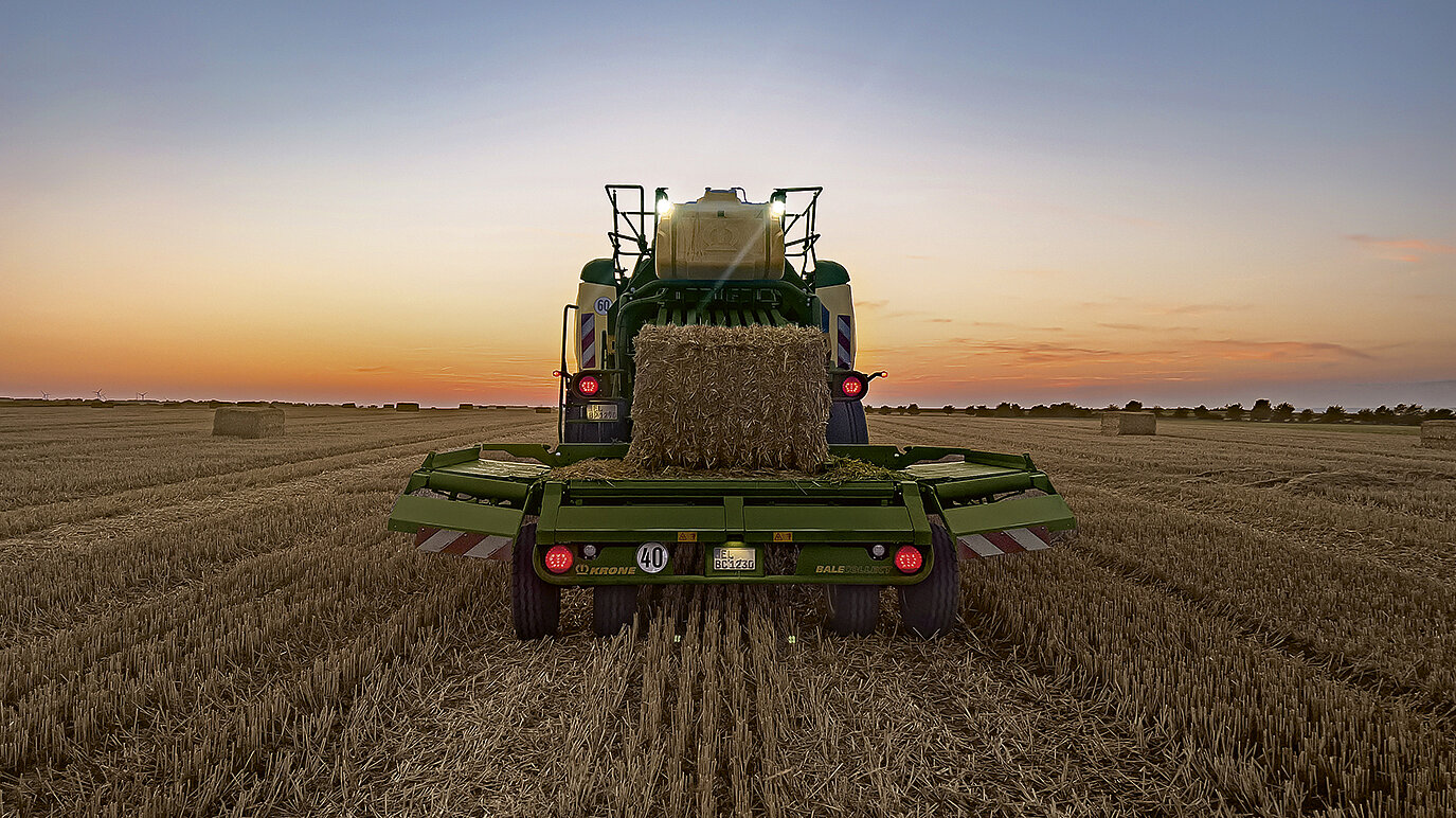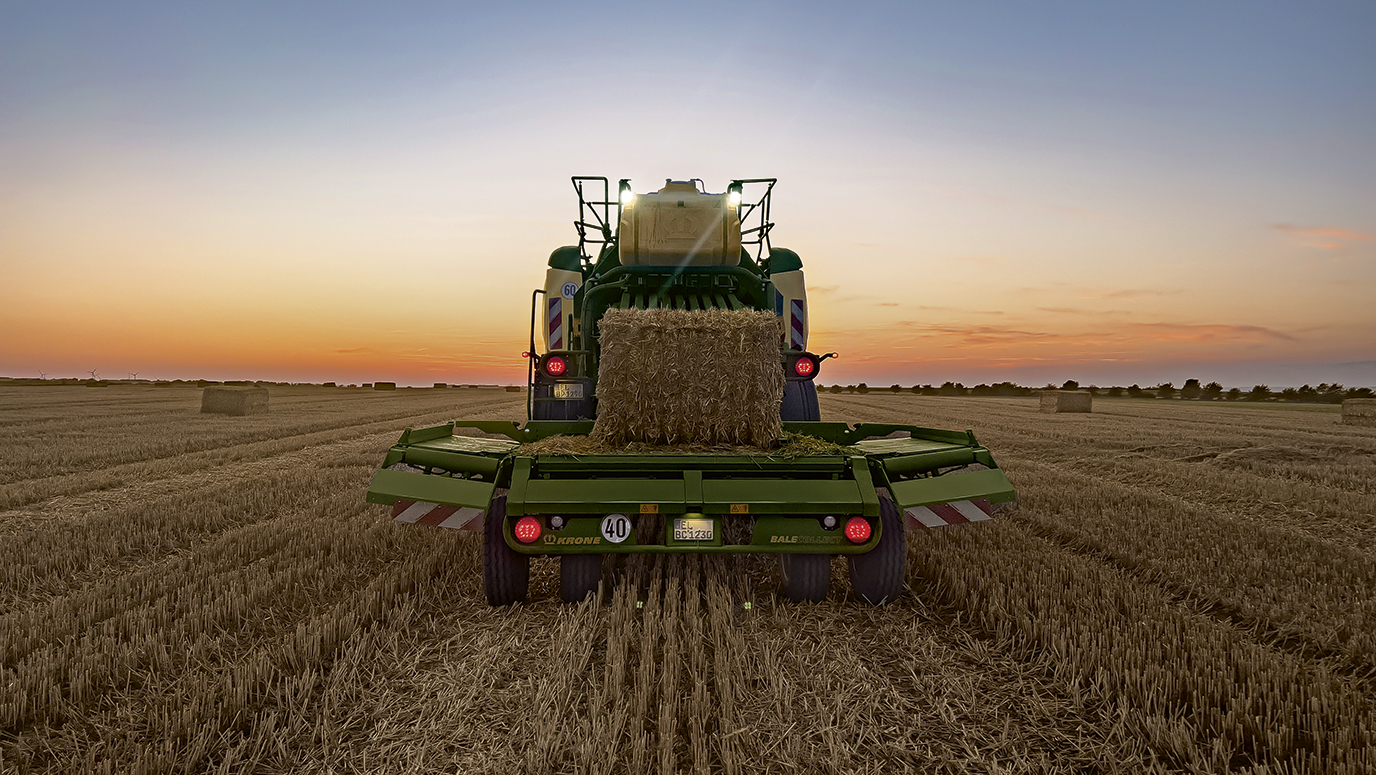 Sammelfunktion Mit dem Ballensammelwagen BaleCollect optimiert KRONE die Strohbergung nachhaltig. Bis zu drei Ballen sammelt BaleCollect im Feld. Auf der Straße folgt BaleCollect der Presse dank teleskopierbarer Deichsel spurtreu und sicher.