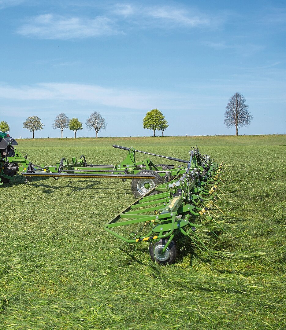 Граблины работают в большую нахлестку, что обе- спечивает равномерное качество распределение и создает идеальные условия для заготовки каче- ственного корма. Равномерная широкая укладка способствует подвяливанию заготавливаемой культуры и сокращает продолжительность под- вяливания. Таким образом, можно оптимально использовать короткие периоды уборки урожая.