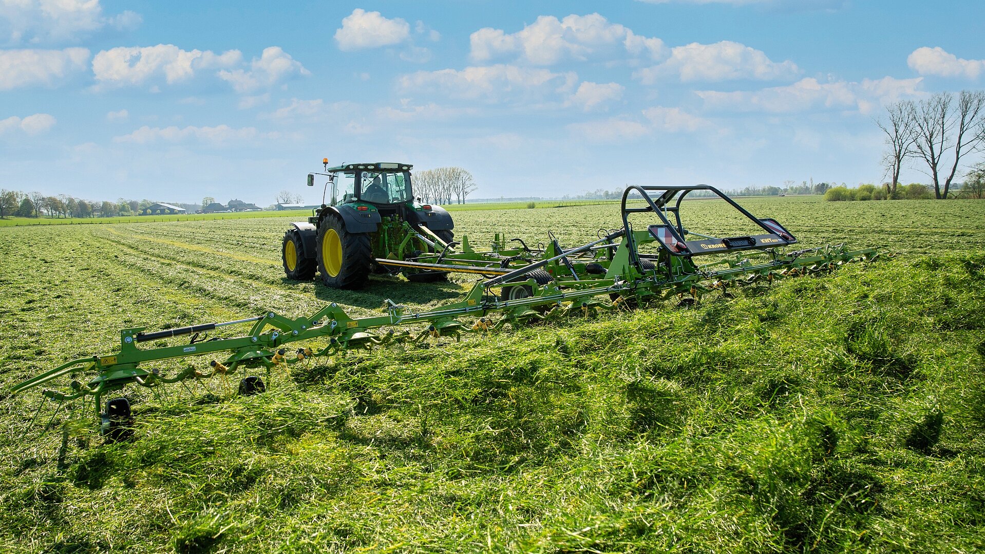 Angebauter Krone Kreiselzettwender KW mit bis zu 10 Kreiseln für hohen Bedienkomfort, geringen Verschleiß und Qualitätsfutter.