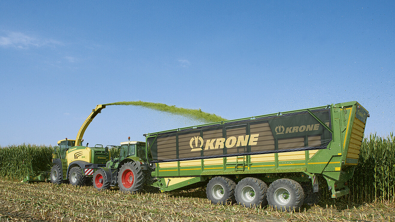 С TX компания KRONE впервые представляет наклоненный вперед скребковый транспортер на прицепе для транспортировки измельченной массы. «Загрузочный карман» увеличивает транспортный объем и обеспечивает лучшее тяговое усилие задних колес трактора в поле. Низкий центр тяжести прицепа улучшает режим движения на склоне и предоставляет высокую надежность при транспортировке на высокой скорости.