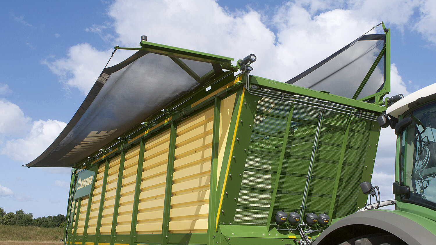 Прицепы для транспортировки измельченной массы KRONE могут дооснащаться крышками для грузового пространства прицепа. Не теряется ничего – даже при быстрой езде по дороге. Крышки грузового пространства открываются и закрываются при помощи гидравлики.