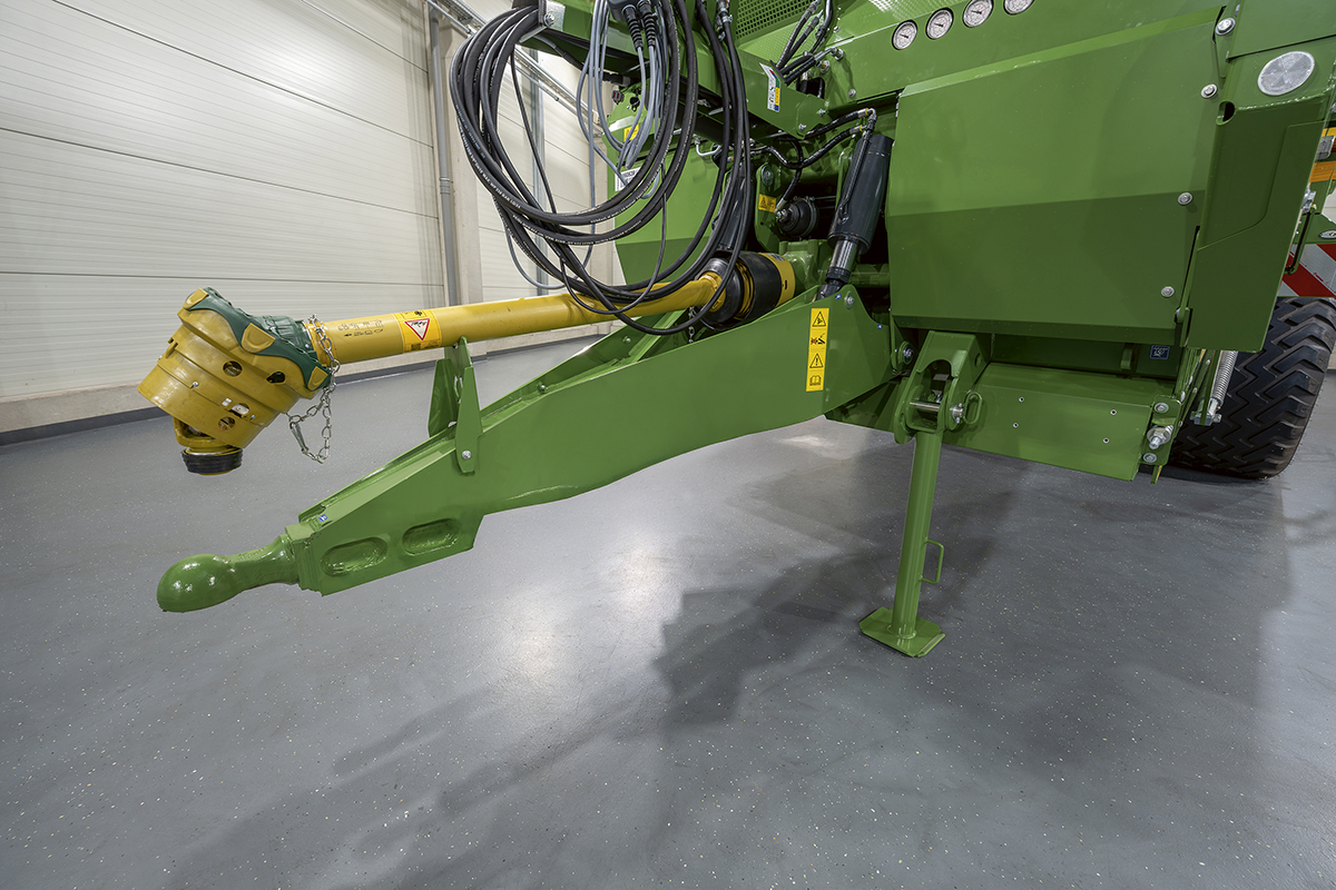 С наклоненным вперед прицепом гидравлически опускаемое дышло обеспечивает преимущества не только при измельчении, но и дает возможность переезжать по глубокой колее благодаря повышенному дорожному просвету. Узкое дышло с тяговосцепным устройством со сцепным шаром подрессорено, что создает высочайший комфорт.