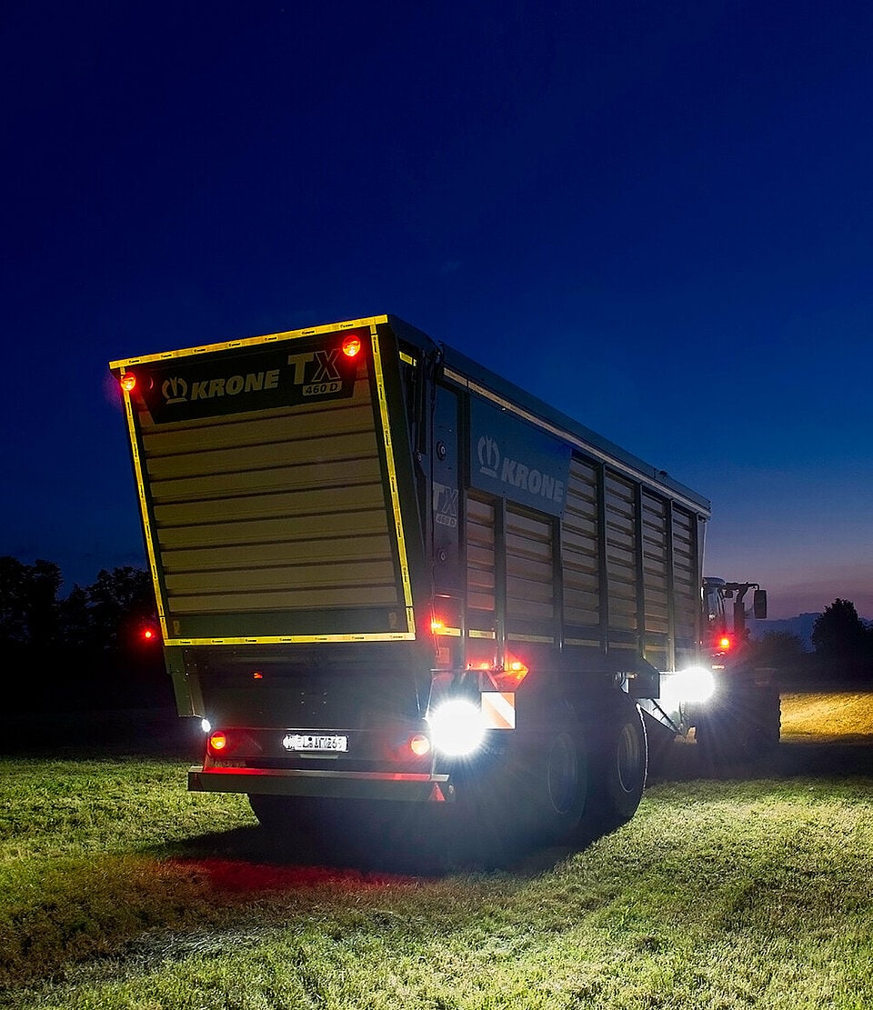 Прицепы для транспортировки измельченной массы KRONE TX могут дооснащаться максимум четырьмя дополнительными боковыми светодиодными фарами (опция). Свет, направленный на ось и окружающее пространство облегчает маневрирование и параллельное движение ночью и обеспечивает безопасность на силосной траншее.