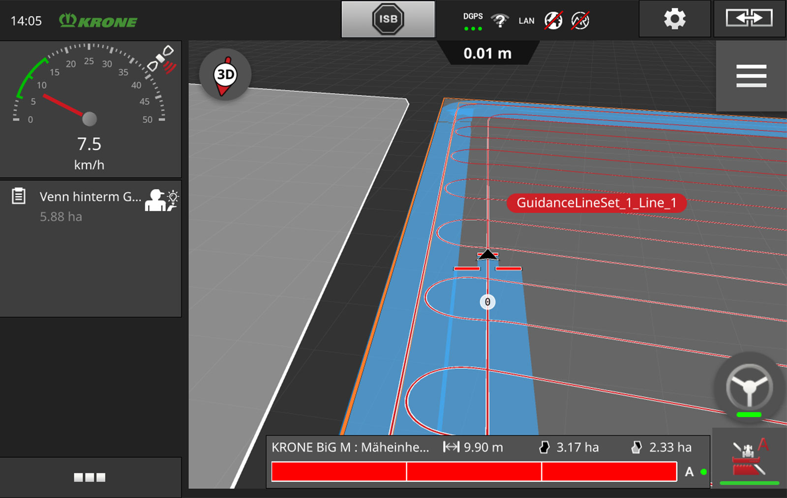 Для автономного трактора VTE на офисном компьютере рассчитывается бесконечная траектория движения, которая беспроводным способом передается в систему управления машины. Бесконечная траектория движения самоходной косилки-плющилки BiG M может быть спланирована и непосредственно в машине. После активации программы движения косилка, оснащенная системой управления GPS Guidance, в полностью автоматическом режиме обрабатывает поле, включая автоматический маневр BiG M на разворотной полосе. Таким образом, водитель может полностью сконцентрироваться на процессе уборки и наблюдении за окружающей территорией. При этом траектория движения на разворотной полосе рассчитывается отдельно с учетом особенностей машины и технологического процесса. Например, при скашивании машина сначала движется по разворотной полосе до того места, в котором животные покидают поле, а затем уже обрабатывает внутренний участок поля. А при обработке почвы с помощью автономного трактора VTE работа сначала выполняется на внутреннем участке поля и после этого - на разворотной полосе.
