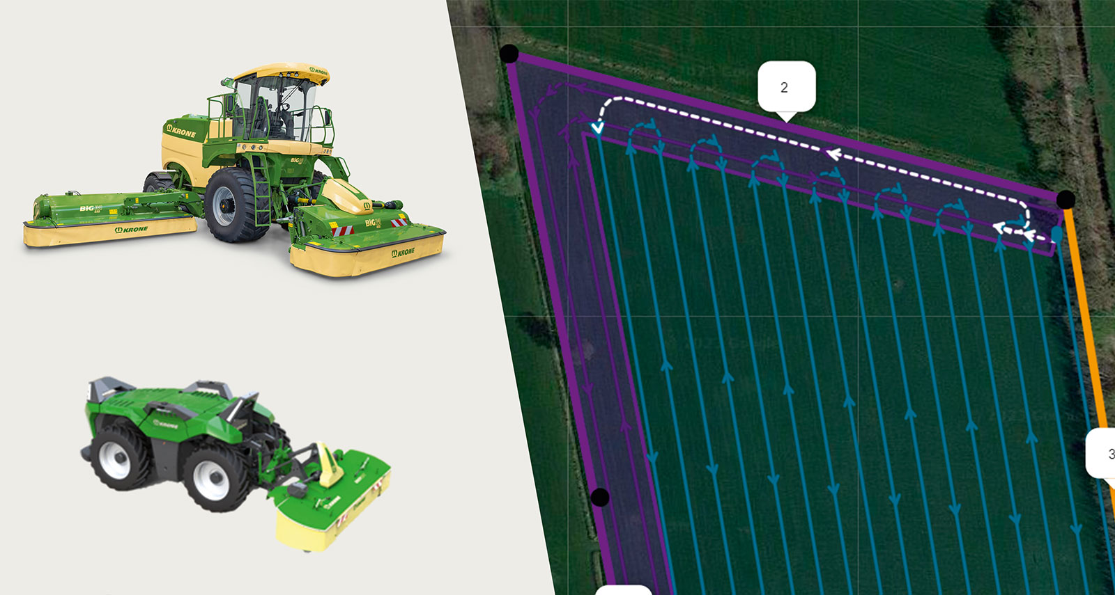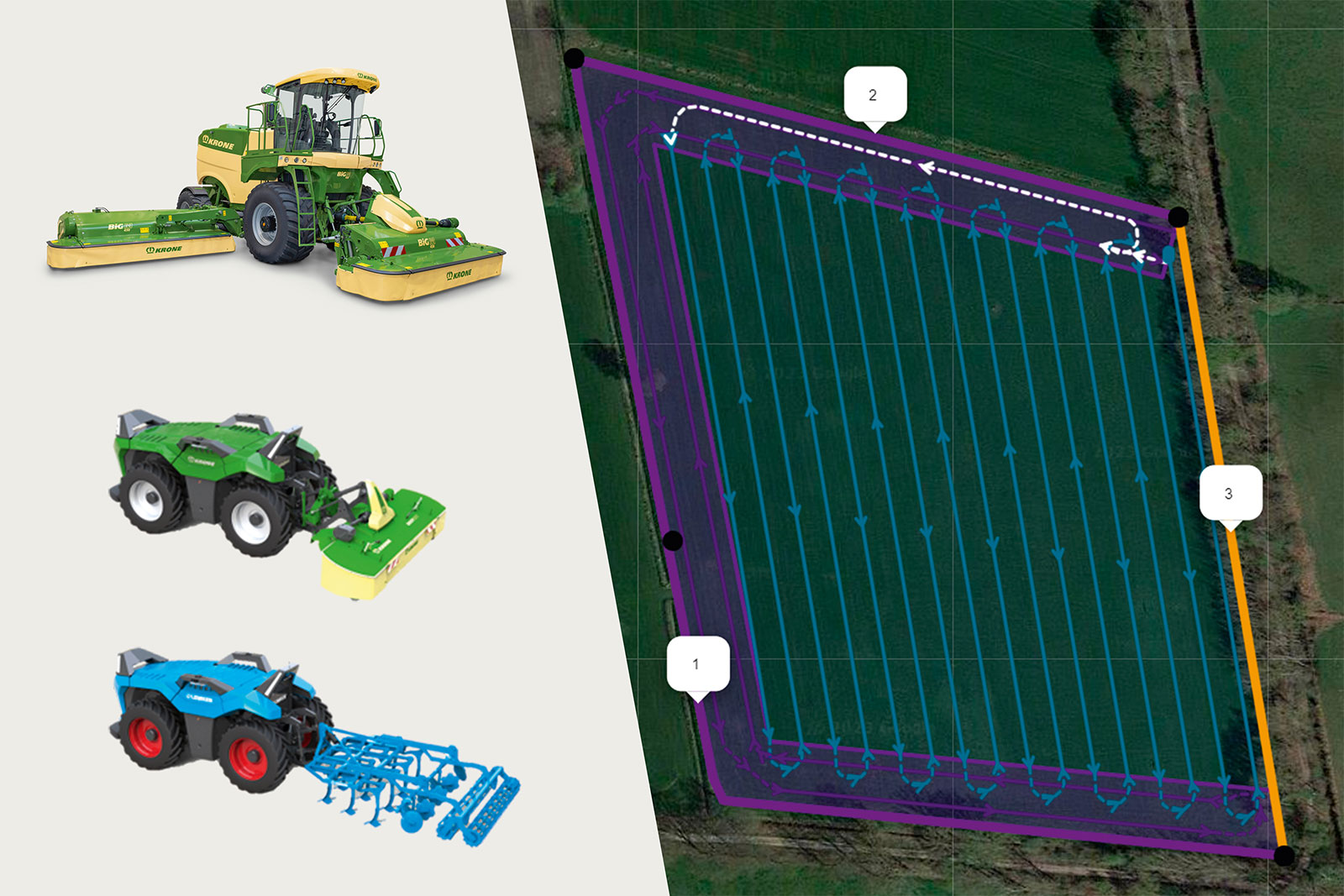 Компании KRONE и Lemken при сотрудничестве с ИТ-компанией Lacos создали полностью автоматизированную систему обработки поля на основе самоходной косилки-плющилки BiG M и автономного трактора VTE. Инновационный расчет траектории движения не только обеспечивает высокую эффективность скашивания, но и защищает технику от столкновений с дикими животными.