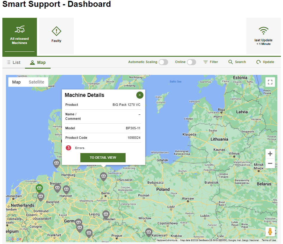 KRONE рассматривает систему Smart Support, доступной через mykrone.green, как инструмент комплексного, эффективного и перспективного сервисного обслуживания в руках дилеров. Поэтому мы готовы предоставлять дилерам доступ к ценным данным, таким как коды неисправностей, местонахождение машины или данные счетчика срока службы машины. Они позволят дилерам быстро реагировать и наилучшим образом готовиться к предстоящей работе. Наша общая цель – свести к минимуму время простоя машины и оптимально использовать собственные ресурсы.