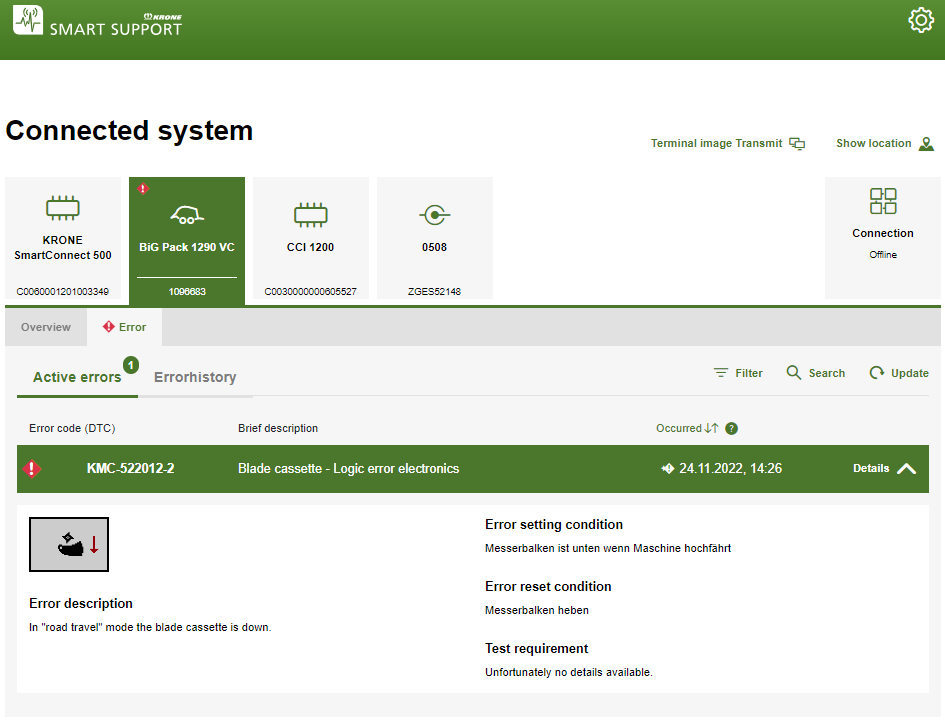 С внедрением телеметрических устройств для техники KRONE открываются новые возможности. Владелец машины получает не только все агрономические данные, но и возможность комплексного сервисного обслуживания через дилера. Система KRONE Smart Support была создана с опорой на этот принцип. Она позволяет дилерам с разрешения владельца техники просматривать ее данные, связанные с проведением сервисного обслуживания.