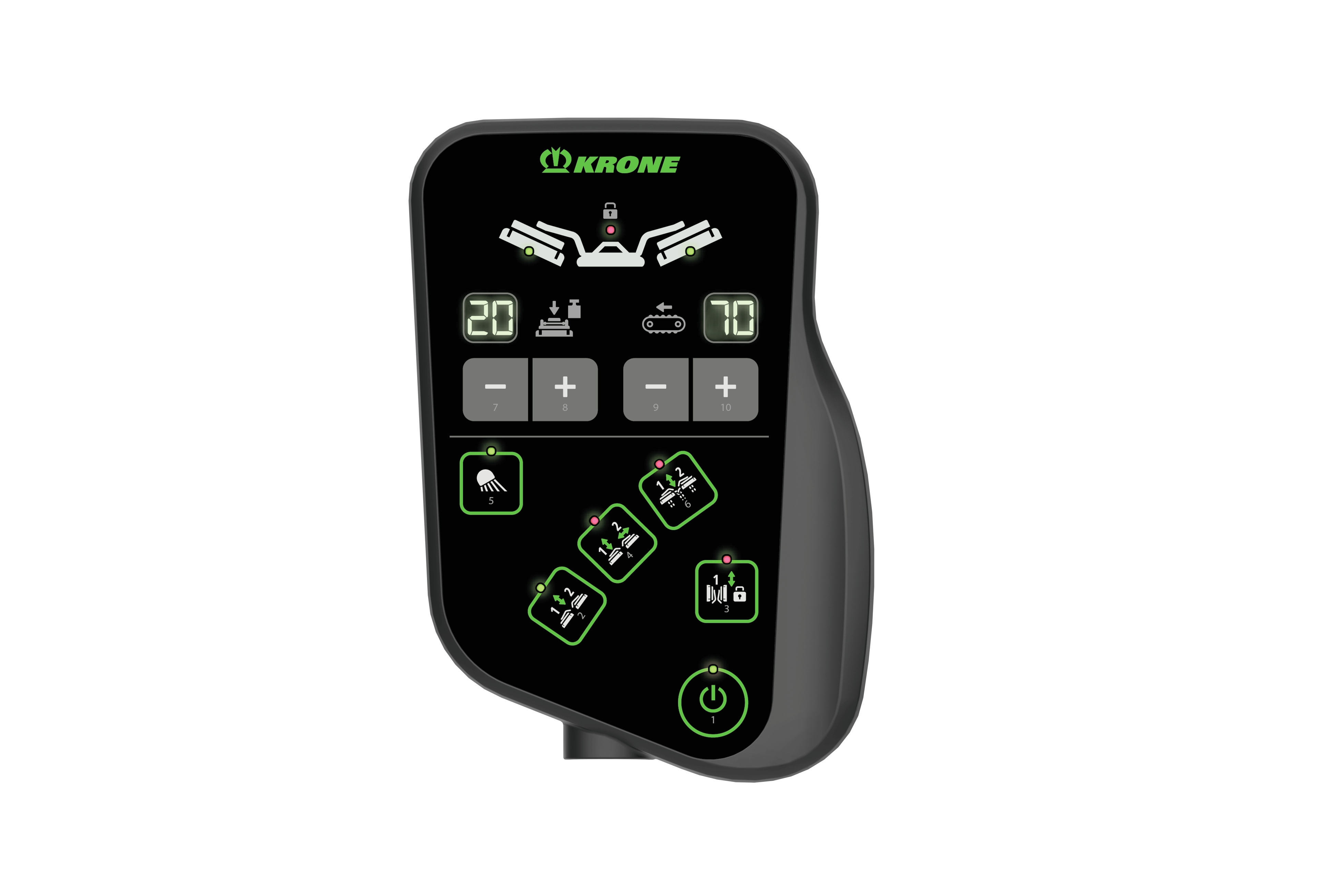 Блок управления KRONE PreSelect DS 50 будет выполнен в современном дизайне в стиле DS 100. Он напрямую подключается к разъему машины и к электропитанию 12 В в кабине машины. Блок управления KRONE PreSelect DS 50 рассчитан на эргономичное одноручное управление при помощи мембранных клавиш. Так, на комбинациях косилок можно предварительно выбирать различные гидравлические функции, например, одно- или двусторонний подъем косилочных агрегатов, регулирование рабочей ширины или откидывание / возвращение в исходное положение поперечных ленточных транспортеров, а затем выполнять данные функции при помощи устройств управления, установленных в тракторе. Светодиодные индикаторы состояния показывают положение приводных механизмов (активный/неактивный), транспортное положение косилочных агрегатов и выбранные гидравлические функции. Опорное давление косилок и скорость поперечных ленточных транспортеров отображаются на дисплее, их можно корректировать при помощи клавиш «минус» и «плюс».