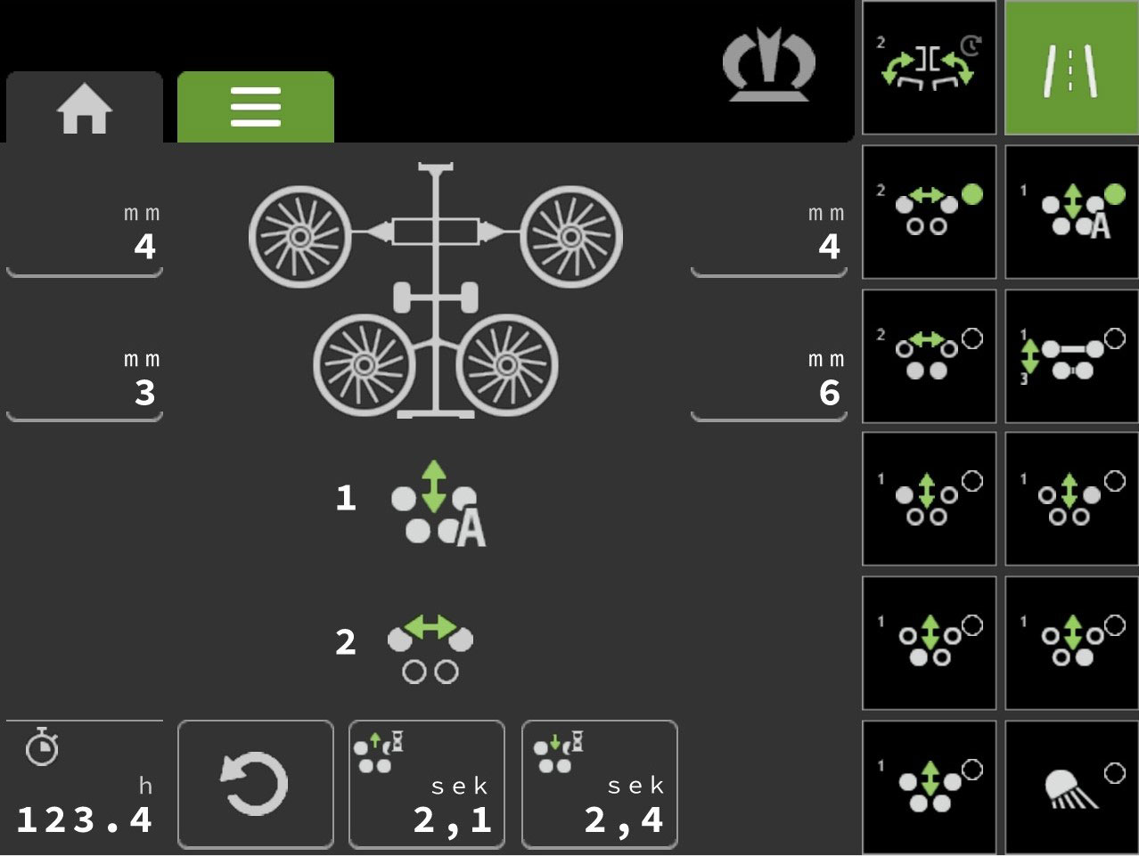 Концепция управления Swadro TC 1250 Plus позволяет еще быстрее и удобнее выполнять настройку работы валкователя с учетом полевых условий. Так, высота положения роторов регулируется уже не вручную, а через терминал из кабины трактора. При этом высота сгребания регулируется индивидуально для каждого ротора, а считать ее показания можно на экране терминала. Все четыре ротора в варианте «Плюс» можно поднимать по отдельности, что очень удобно, например, при формовании валков на клиновидных участках поля. Так же, как на Swadro TC 1250, можно замедлить подъем задних роторов относительно передних, чтобы облегчить работу на поворотной полосе. На Swadro TC 1250 Plus функция задержки подъема роторов позволяет оптимально адаптироваться к полевым условиям при помощи ввода временного значения на терминале в кабине трактора.