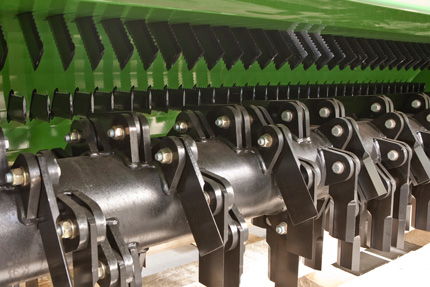 Сами ножи были также модифицированы специалистами фирмы Krone. Во-первых, количество ножей на вале измельчителя было увеличено с 72 до 88 штук; во-вторых, вес каждого ножа был удвоен. Как показывают результаты различных тестов, даже при тяжелейших условиях прессования соломы, ножи продолжают оставаться в рабочем положении. На двух регулируемых без помощи инструментов рамках закреплены 94 ножа-противореза. Причем вторая ножевая рама с противорезами снабжена теперь не треугольными ножами, а продолговатыми. Внутренний контур корпуса был также оптимизирован с целью улучшения потока измельчаемой массы. Минимальная теоретическая длина резки составляет 21 мм. Благодаря особому принципу работы (измельчение подтрамбованного материала), отпадает необходимость в ежедневной заточке ножей.