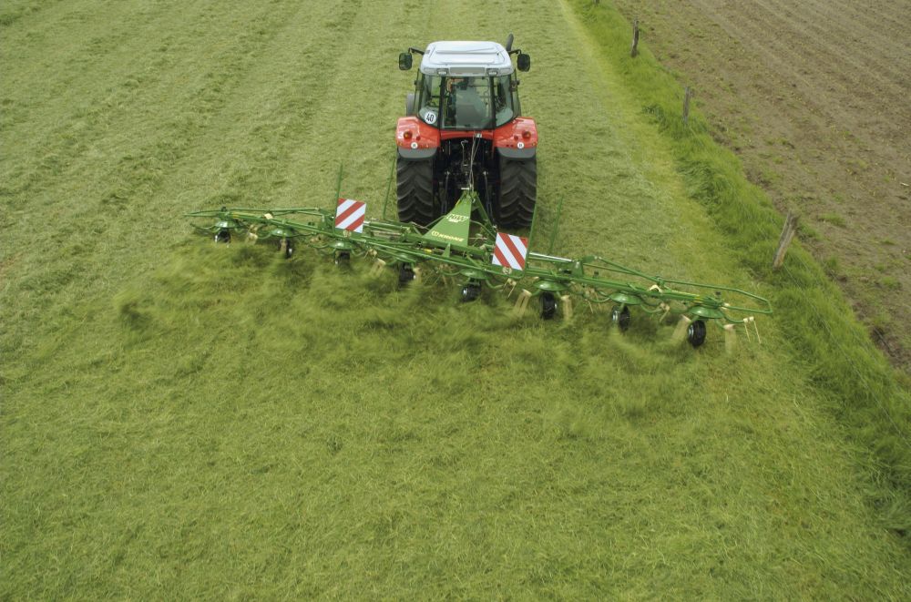 Другие преимущества ворошителя: Со сложенными роторами KW 8.82/8 размещается на тракторе чрезвычайно компактно и хорошо перевозится благодаря выгодному положению центра тяжести. К тому же машина при установке на хранение не занимает много места. За превосходное качество распределения отвечает устройство ручного управления для работы на приграничных участках.